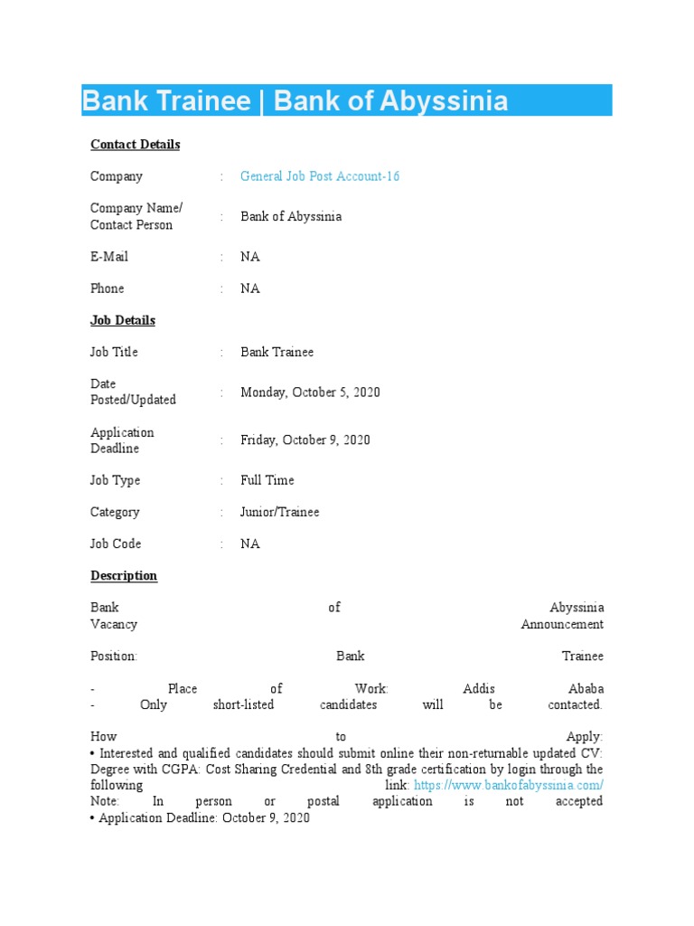 Abyssinia Bank Vacancy 2020 : Latest Jobs From Bank Of Abyssinia / Bank vacancy 2020/icici bank recruitment 2020/govt jobs in nov 2020/sbi bank recruitment 2020/oct 20 подробнее.. 10.02.2020 · bank of abyssinia vacancy announcement, february 2020 get link; Bank vacancy 2020/icici bank recruitment 2020/govt jobs in nov 2020/sbi bank recruitment 2020/oct 20 подробнее. Hq building, the gambia road, legehar addis ababa, ethiopia. It's a great opportunity to work under them. It also attracted many professional staff members, valuable shareholders, and large customers.